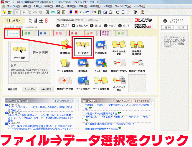 ![]() ダイレクトメニューで【ファイル】から【データバックアップ】を選択します。 topに戻る |