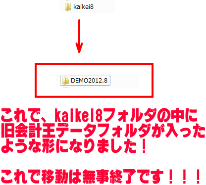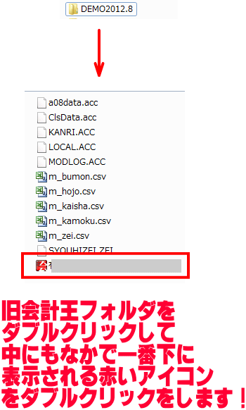 | 後は、最後に下記のフォルダをクリックして、中にある 赤いアイコンをダブルクリックすれば、旧会計王データが 新しいパソコンに登録されることとなります。 |