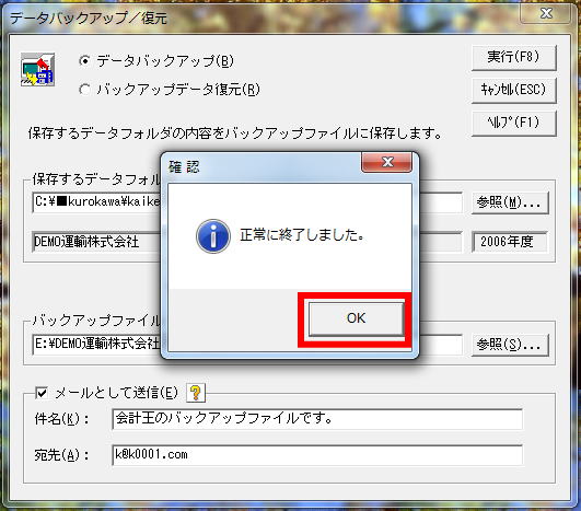 ![]() 会計王のデータのバックアップを実施して、その時に下のチェックボックス にチェックを入れて、送りたい相手先のメールアドレスを入力します。件名も 相手に何を送っているかわかる内容を入力してください。 topに戻る |