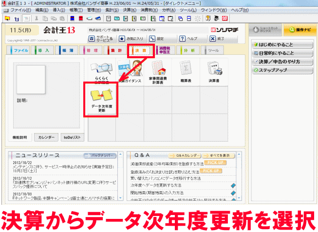 | topに戻る その年度が終了して、次年度の会計データの入力をする場合には まずは、決算タブよりデータ次年度更新を選択します。 ![]() |