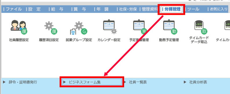 | どんな文章が作成できるか確認してみましょう! 【労務管理】から【ビジネスフォーム集】をクリック ![]() |