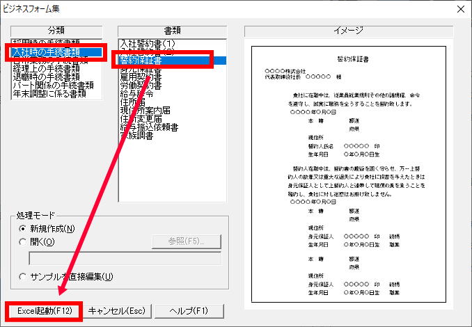 | 【分類】から【書類】を選択します。 その際には、まずは【分類】でどのシーン(入社や退社)で 文章が必要になっているかを選択してから書類を選んで下さい。 最後に、下の【Excel起動】をクリックで、Excel文章が立ち上がります。 ![]() |