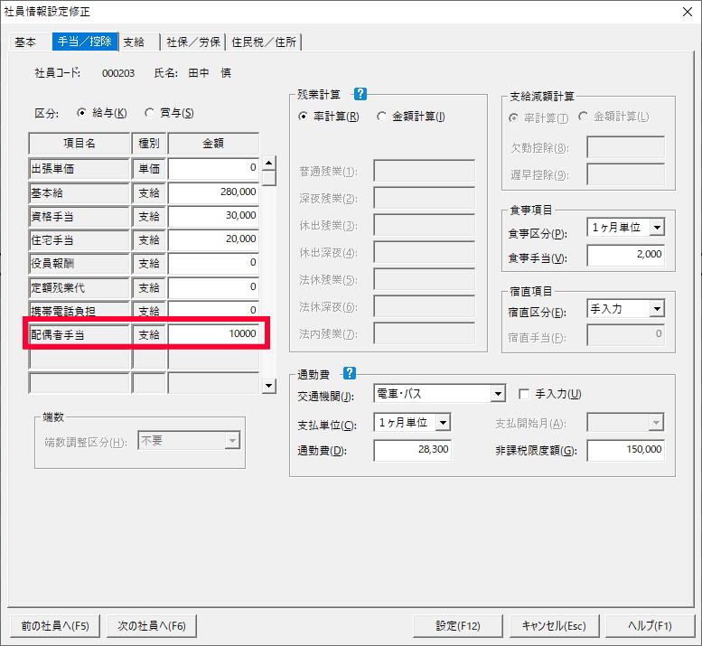 では、最後に実際の給料入力画面で追加されているか確認をしてみます! 【給与】から【給与データ入力】をクリックしてください。 ![]() 下記のように【支給項目】で【配偶者手当(例)10,000円】が追加されていて、 ![]() |