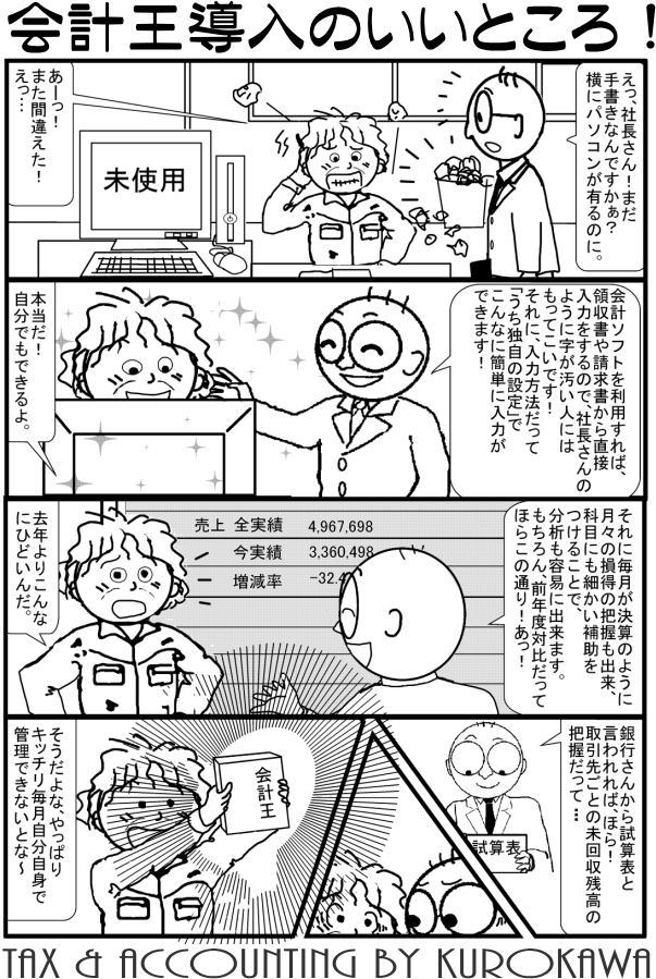 四コマ漫画でわかる 会計王の導入のいいところ 、 ![]() 私が20代後半の頃にお世話になっている会計事務所の先生に無理を言ってソリマチ会計王を導入してもらいました。ですから、会計王を扱いはじめてから20年以上が経過していることとなりますね。 ![]() 黒川税理士事務所の求人募集 |