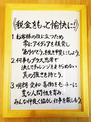 私たちの経理理念 《税金をもっと愉快に!》 1.お客様の役に立つため 常にアイディアを模索し 「ありがとう」を生き甲斐にしよう。 2.何事もプラス思考で 決してチャレンジをあきらめない 真の強さを持とう。 3.明朗・愛和・喜働をモットーに 豊な人間性を育み、 みんな仲良く協力し、仕事を楽しもう。 |