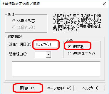 まずは、「設定」から「社員情報設定」で退職する社員を退職扱いとします。 ![]() 退職する人を選んで、右上の「退職/復職」をクリック ![]() 「退職年月日」を退職日をきちんと入れて、「区分」を退職として、開始をクリック ![]() 今度は、「年調」より最初に@として「年調年度指定」を選択して下さい。 ![]() 令和元年の退職であれば、「平成29年」を選択してしたの「設定」をクリック ![]() 次にAとして「年調」から「年調データ入力」を選択してください。 ![]() 何も考えずに 開始をクリック ![]() 下記のような画面となりますので、左側で退職する退職者を選択{この例では 退職 太郎}すると、真ん中編に「退職 太郎」が選択されている画面となります。そこで「年調計算」の下のチェックボックス(年税額計算をする)のチェックを外して空欄にします。そして、上の「確定」をクリックしてください。 ![]() 最後にBとして、「年調」から「源泉徴収票」を選択してください。 ![]() 下記のような画面が出てきますので、右上の「印刷」をクリックしてください。 ![]() 下記の画面では、源泉徴収票の「白紙用紙」を選択してください。 ![]() 「印刷」画面が出てきますので、左下の「詳細設定」から ![]() 中段の「印刷する社員を選択する」より「印刷対象者」を選択して、設定! ![]() そして、この画面が出てきましたら、「印刷」をクリックすると、退職者 「退職 太郎」の源泉徴収票が印刷されることとなります。お疲れ様でした。 ![]() 給料王で従業員さんの中途退社の際の源泉徴収票の発行方法とは?29.4.26 給料王の社会保険と労働保険の料率設定変更をするには、どの画面でするの?29.4.24 給料王で自社の給与の支払い期間の設定が重要となります。 会計王のくろちゃん top |