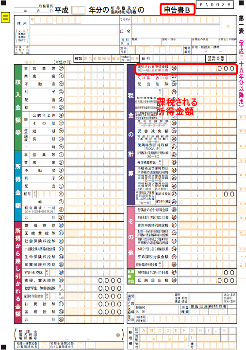 【年間】所得の額とは、 ■確定申告書Aの方は「21」の金額を入力してください。 【確定申告書の上に申告書Aや申告書Bという記載があります。) ![]() ■確定申告書Bの方は「26」の金額を入力してください。 【確定申告書の上に申告書Aや申告書Bという記載があります。) ![]() ■給与所得者の方(確定申告をしていない方)は、 源泉徴収票の 給与所得控除後の金額▲所得控除の合計額=●●を 入力してください。 ![]() ![]() 税金をもっと愉快に! 税金のくろちゃん (千葉市:黒川会計) 《免責事項》 このサイトは、十分に注意して制作していますが、その利用により生じたあらゆる損害について制作者は一切の責任を負いませんので、予め御了承ください。 税金のくろちゃんへの パソコンからのアクセスは www.k0001.com |