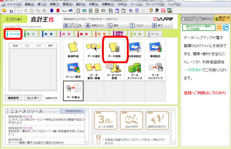 ![]() ダイレクトメニューの【ファイル】から【データ削除】を選択 topに戻る |