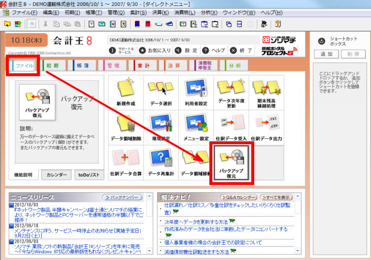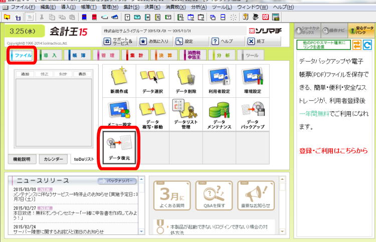 topに戻る![]() ダイレクトメニューの「ファイル」から「バックアップ復元」をクリック |