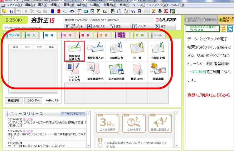 | 復元された後の会計王のダイレクトメニューが表示されますので、ご確認下さい。 | ||||||||||||||||||||||||||||||||||||||||||||
